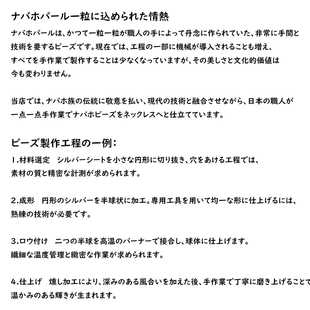 ナバホパールは、ナバホ族が具体的には1850年頃にナバホ族のアツィディ・サニがメキシコ人から学んだ銀細工技術を独自に発展させたものです。一粒一粒が職人の手で丁寧に作られ、その形状は調和と永遠の循環を象徴しています。シルバーの輝きは希望と生命力を表し、ナバホ族の文化と誇りを未来へ紡ぐ重要な役割を担っています。