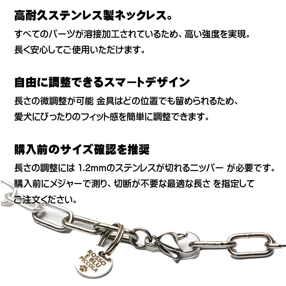 カニカン金具で自在な微調整 微小調整オプションはございませんが、カニカン金具をチェーンのどこにでも装着可能。これにより、愛犬一頭一頭の首にぴったりフィットするよう微調整ができ、快適な装着感を実現します。