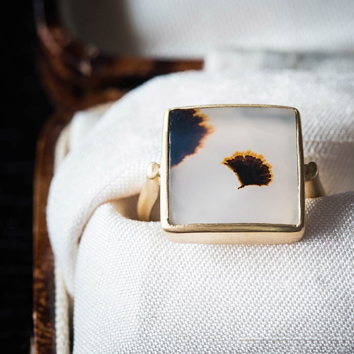 大人の女性に似合うシンプルながらクラシカルでアンティークな雰囲気の18金リングに仕上げています。石枠もリングもこのデンドリティックアゲートに合わせて0から創り出し、すべてがハンドメイドです。